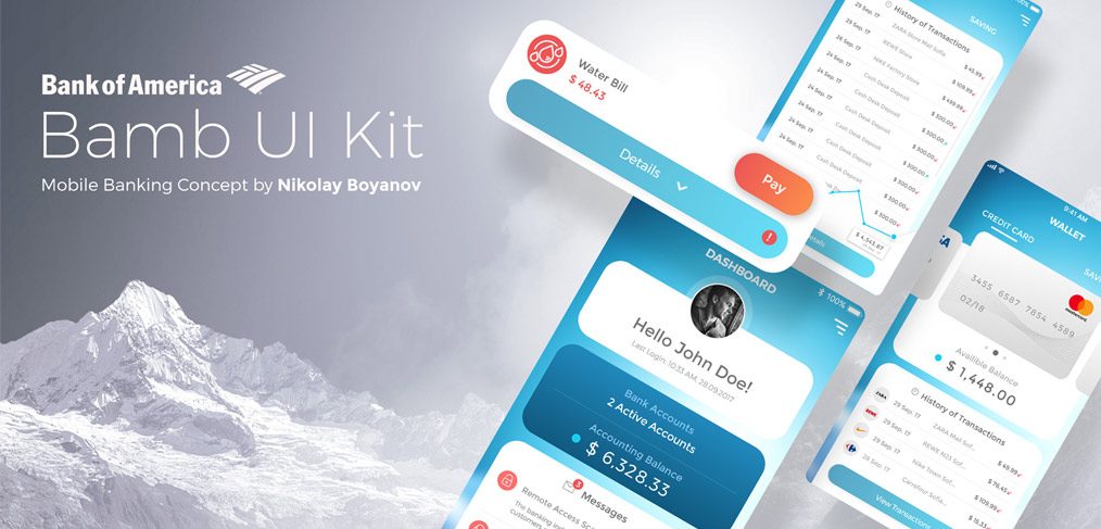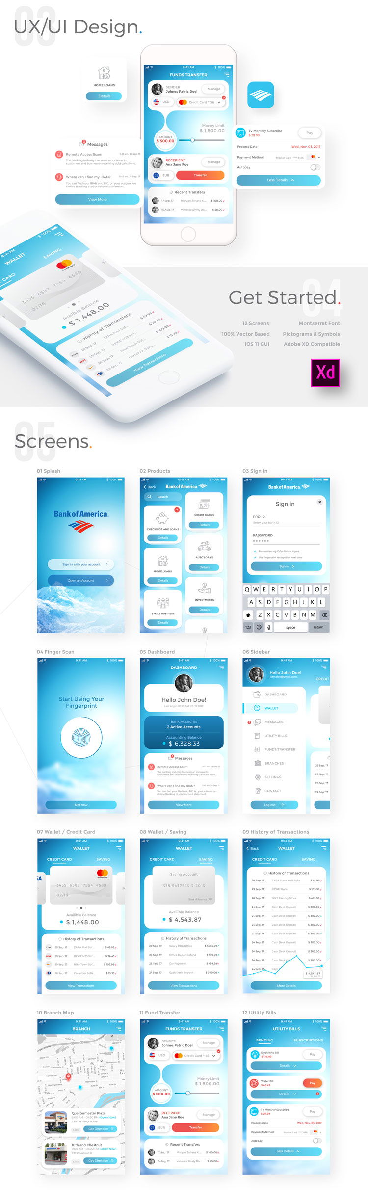 It’s a free UI kit for Adobe XD made of 12 mobile screens, forming a beautifully designed banking mobile app (branded as Bank of America).