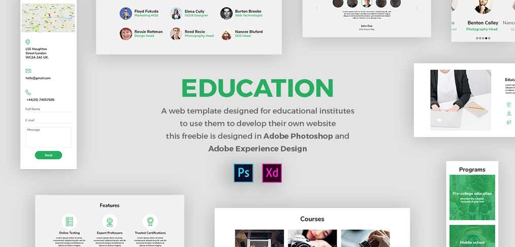 This web template designed by Vivek Popat has been built to help educational institutes to develop their own websites. XD file free to download.